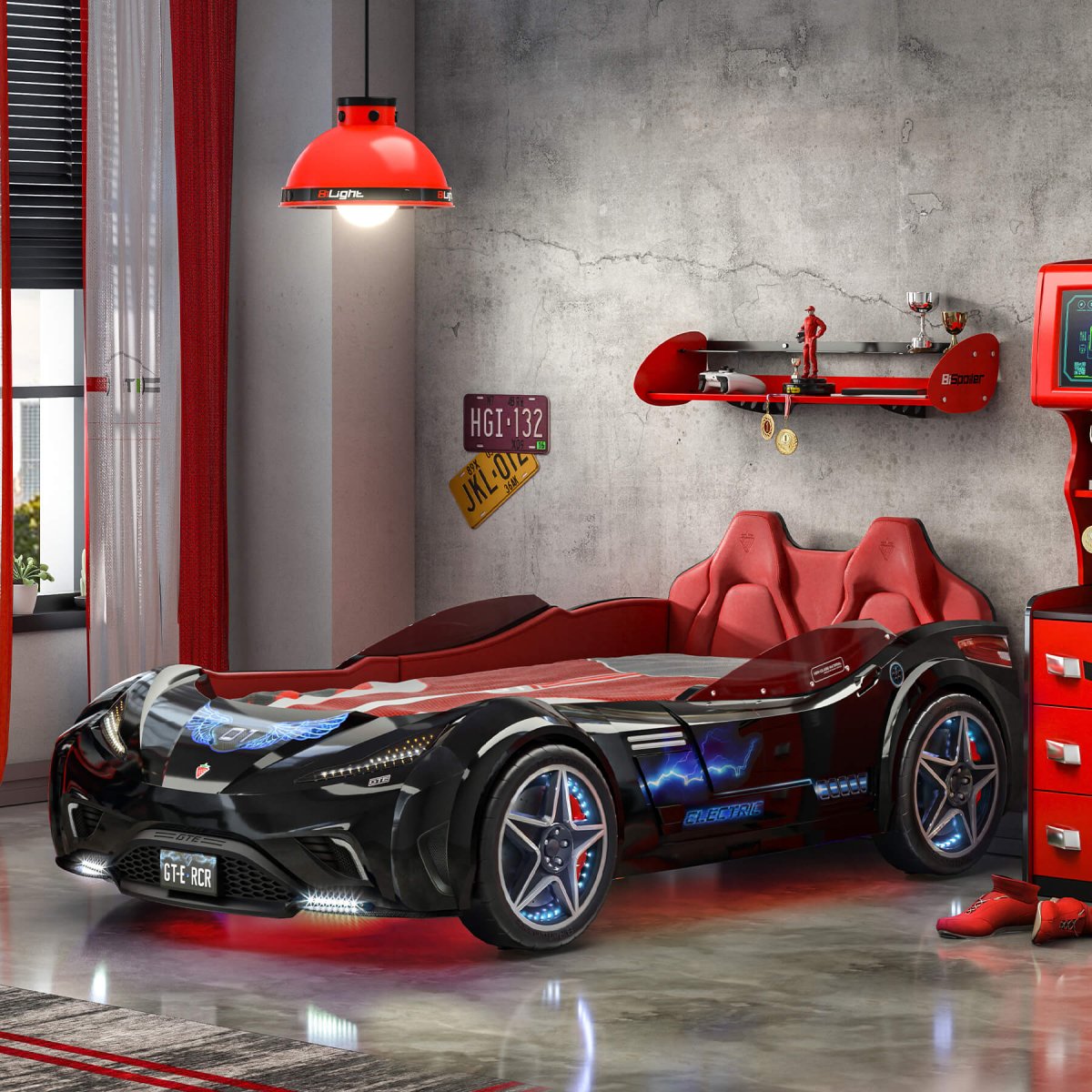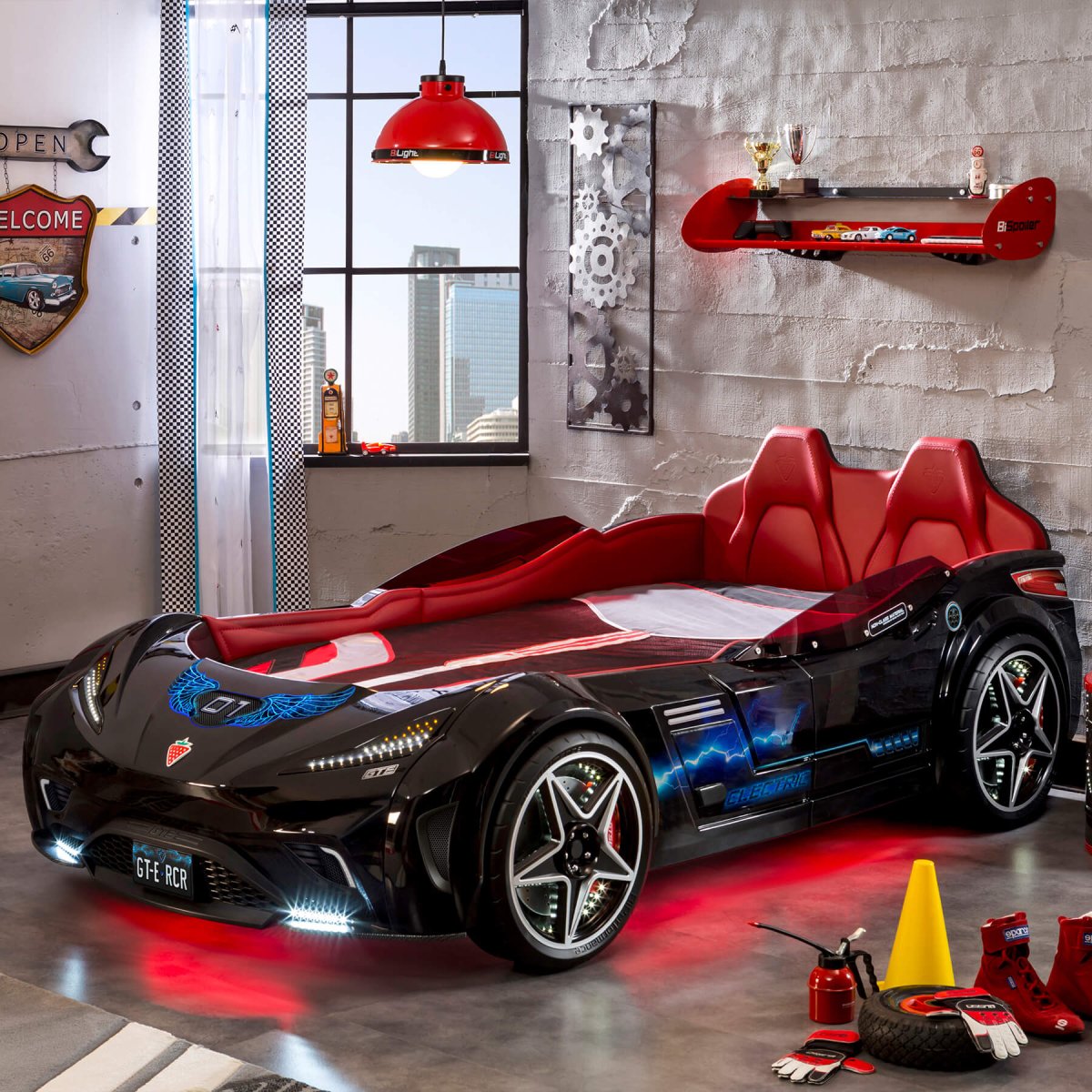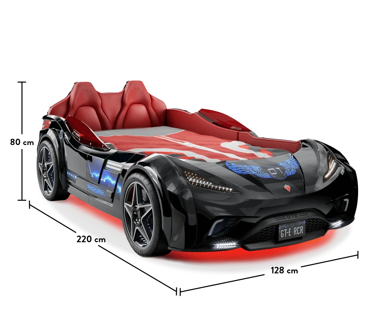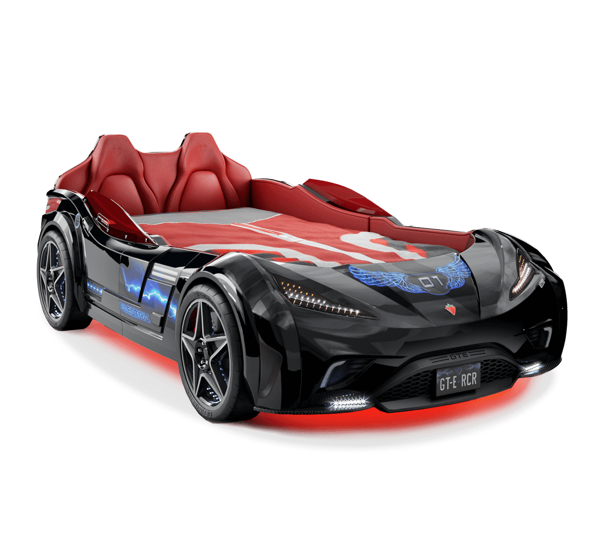 سرير السيارة GTE الذي يتميز بمظهر السيارة الرياضية الحقيقية بتصميمه الداخلي والخارجي، يوفر خيارًا رائعًا لغرفة الطفل بلونه الأسود. إنها تثري خيال أطفالك بصوتها الواقعي وحوافها النجمية وتصميمها المضيء بتقنية LED. بفضل مادة البوليسترين المتينة المستخدمة في إنتاجها، فإن مرتبة السيارة GTE آمنة للغاية ويمكن استخدامها لسنوات عديدة.