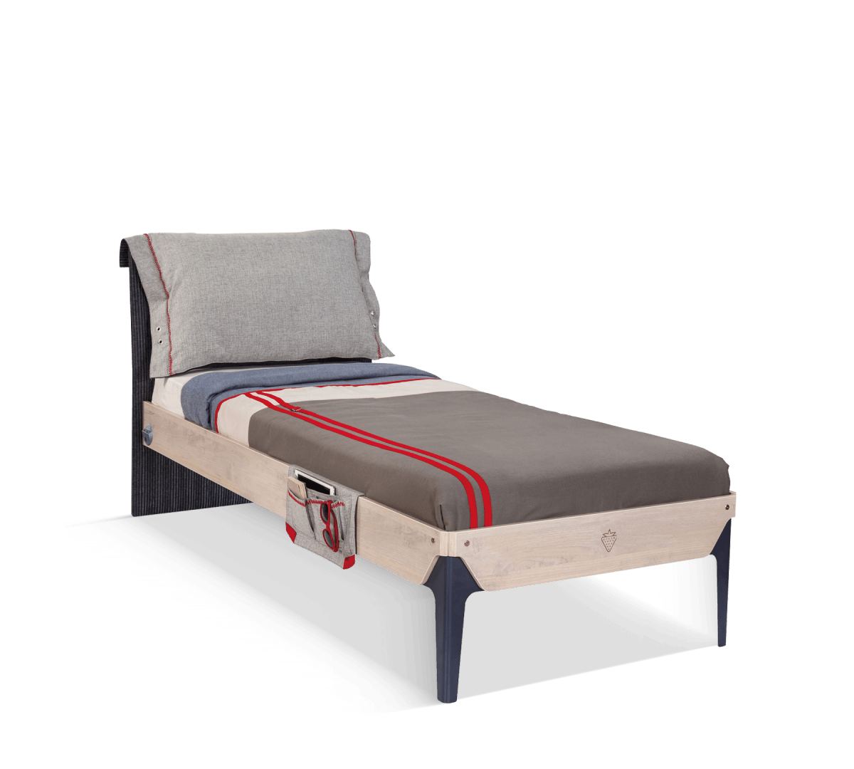 تصميم جانب السرير الناعم المغطى بالقماش على الوجهين يجعلك تشعر بالراحة ليس فقط أثناء النوم ولكن أيضًا أثناء قضاء الوقت في السرير. جيب قماشي على الجانب؛ يمكن استخدامه لتنظيم الأغراض الشخصية مثل الأجهزة اللوحية والكتب والنظارات. يتميز إطار السرير الثلاثي بتصميمه البسيط والحديث، مما يضفي جوًا هادئًا على أماكن معيشة الشباب.