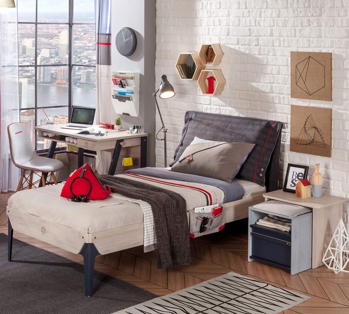 يعتبر Trio Bedstead، بمقاسه 100 × 200 سم، فعالاً في مساعدة الشباب على الاستمتاع بتجربة نوم مريحة وهادئة. Trio Bedstead، وهو تصميم مفيد للغاية للشباب الديناميكي، تمكن من جذب الانتباه بميزاته الوظيفية. تعد وحدة الشحن USB الموجودة بجانب السرير إحدى الميزات التي تجذب الشباب.