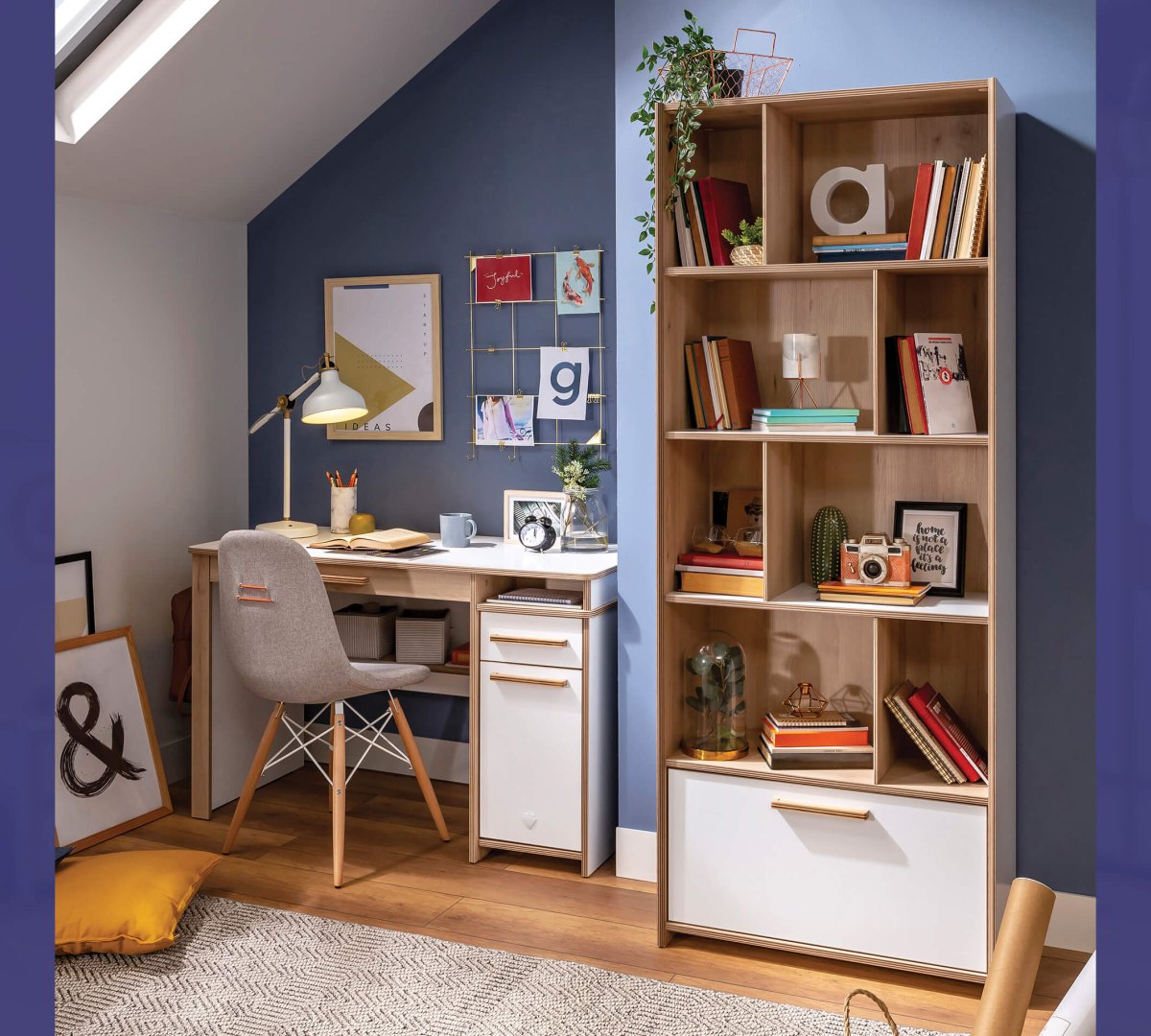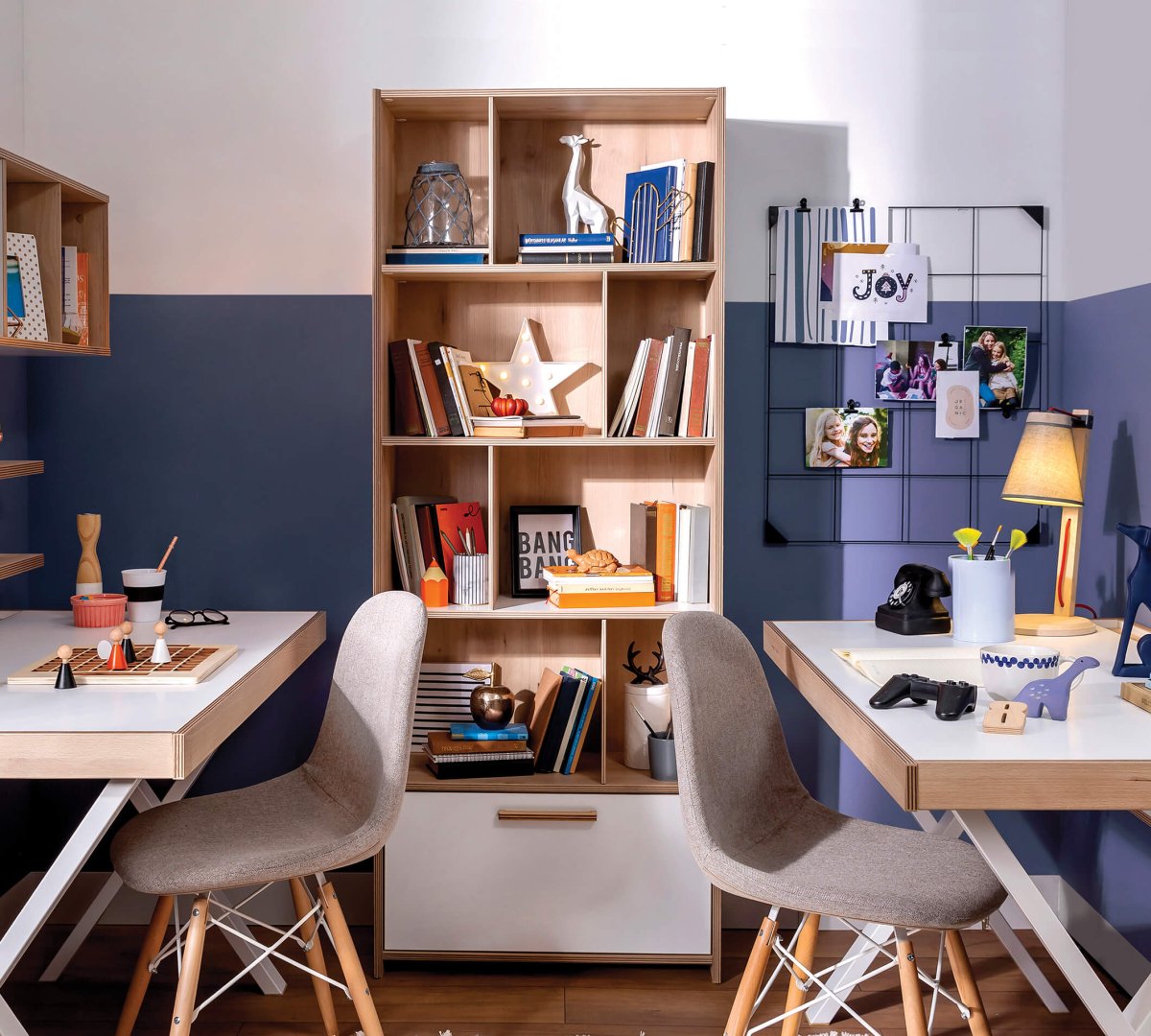 Offering a practical solution for a youth room with its large internal volume and shelves divided into different intervals, the Modera bookcase provides a more tidy look with its cabinet section with bumper doors .