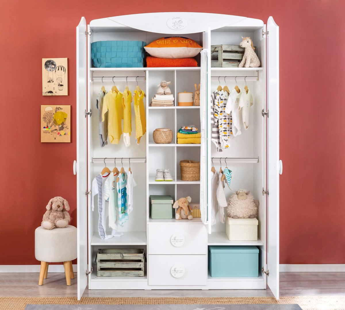 Cabinet doors open and close silently and easily using the slow hinge feature. It is also very safe against possible accidents/jamming. The feature of four removable hangers is one of the elements that makes the unit perfect. Designed with rounded corners in line with the Baby Cotton series, the unit can be easily used right up until infancy.