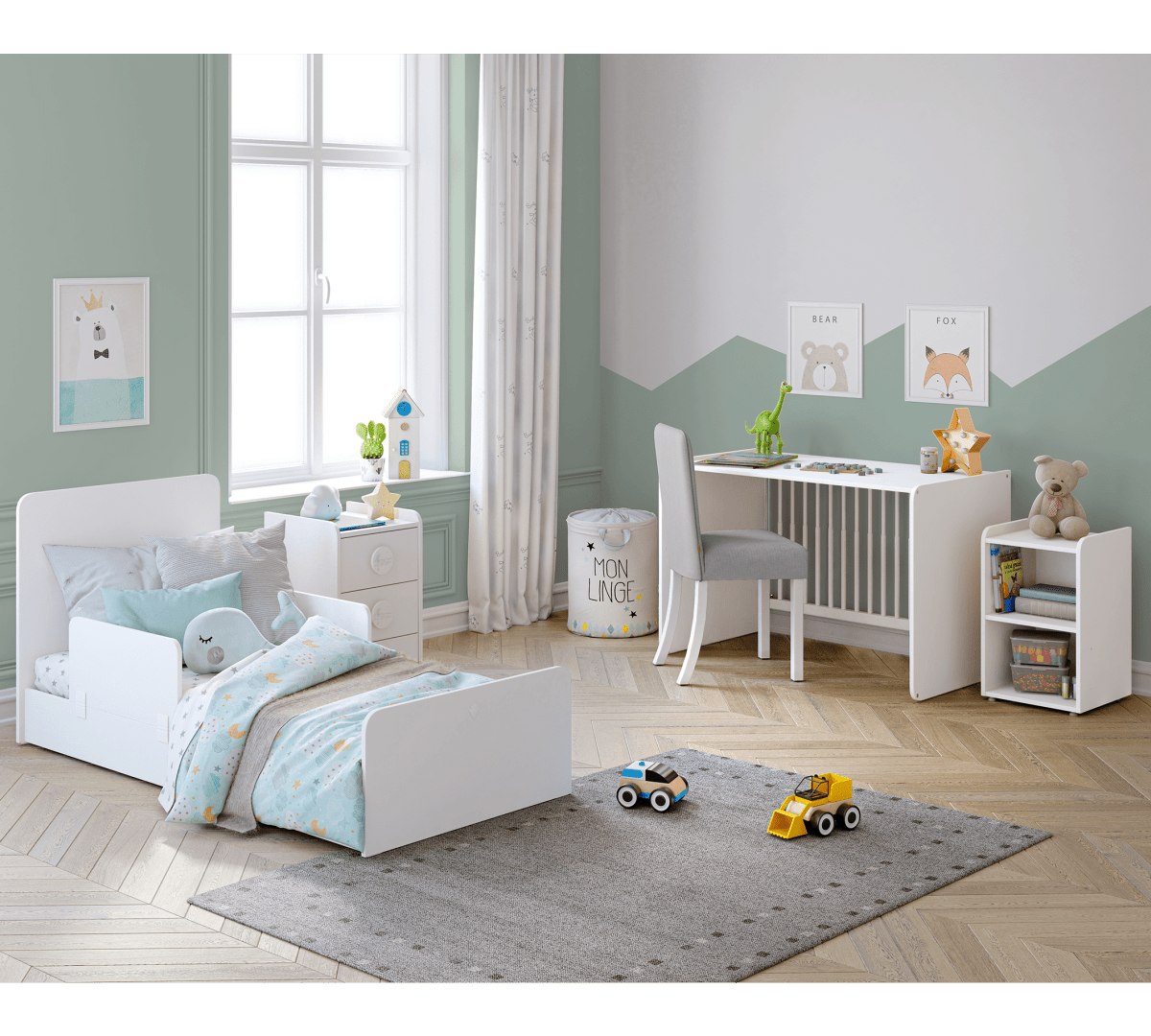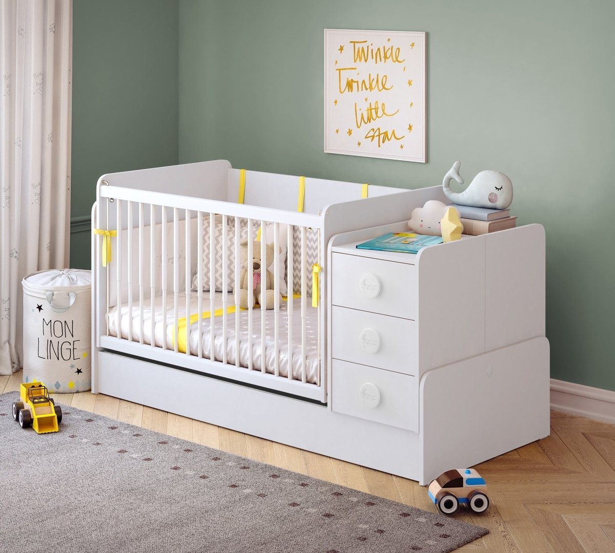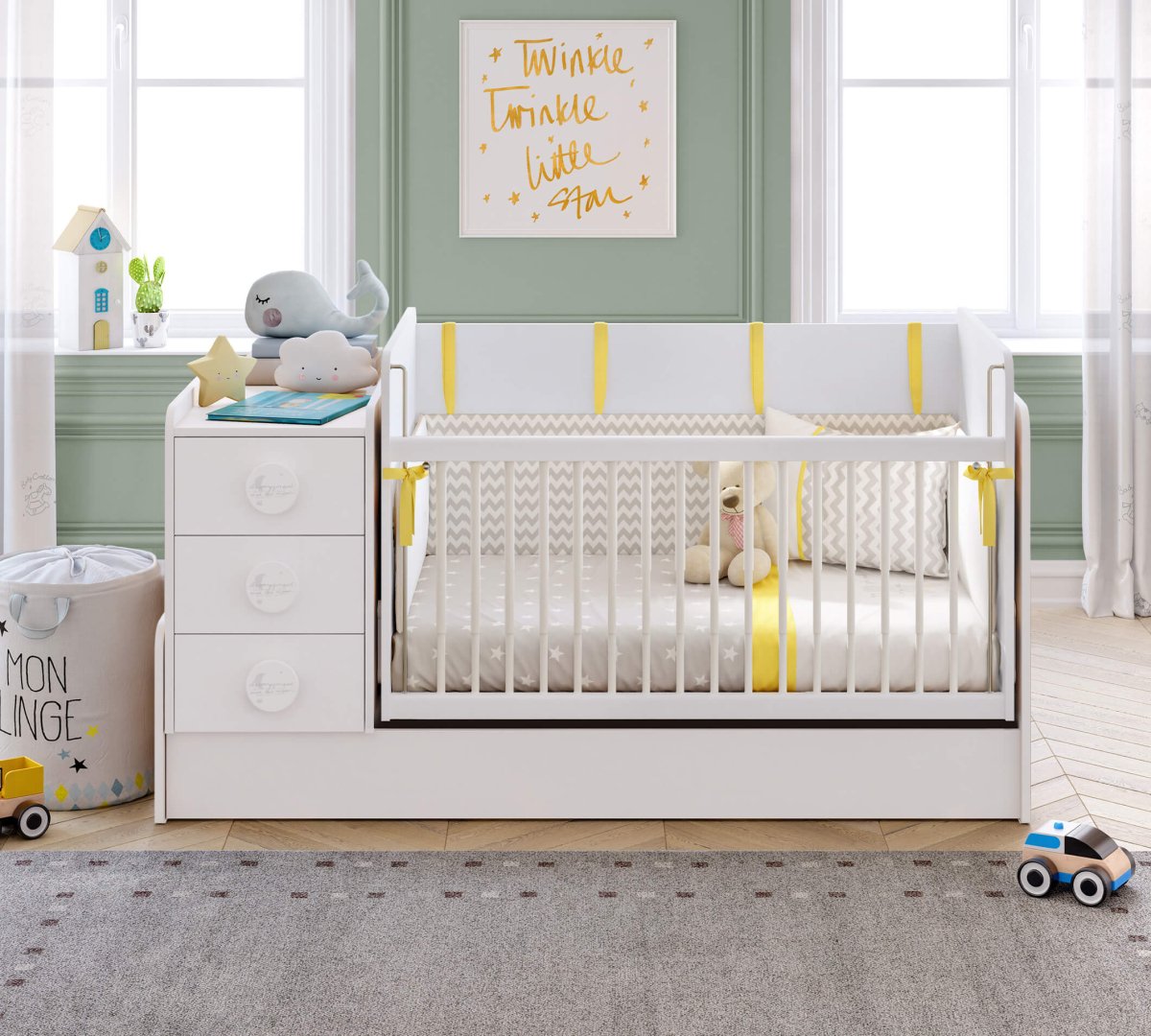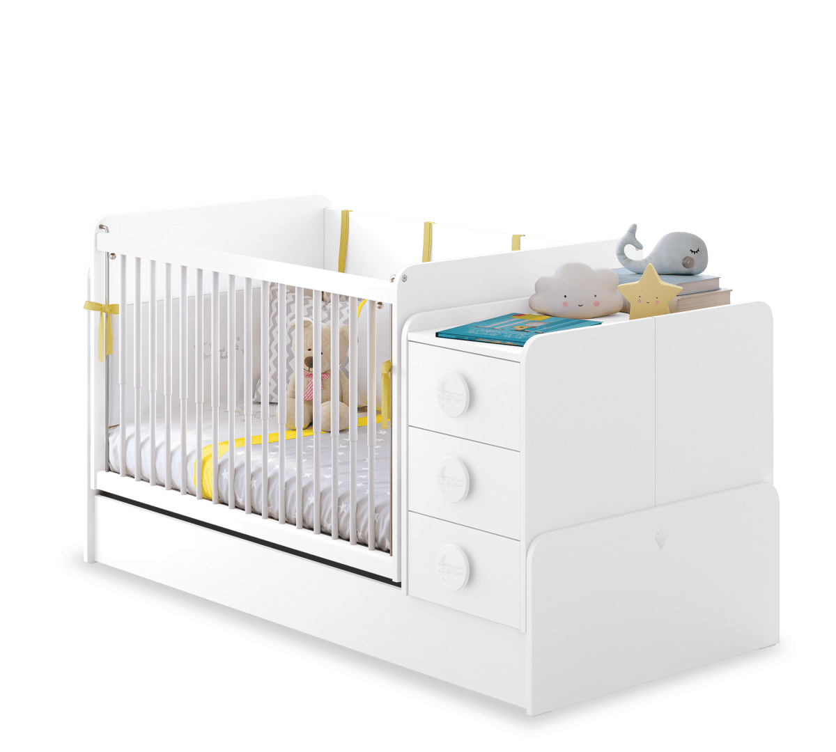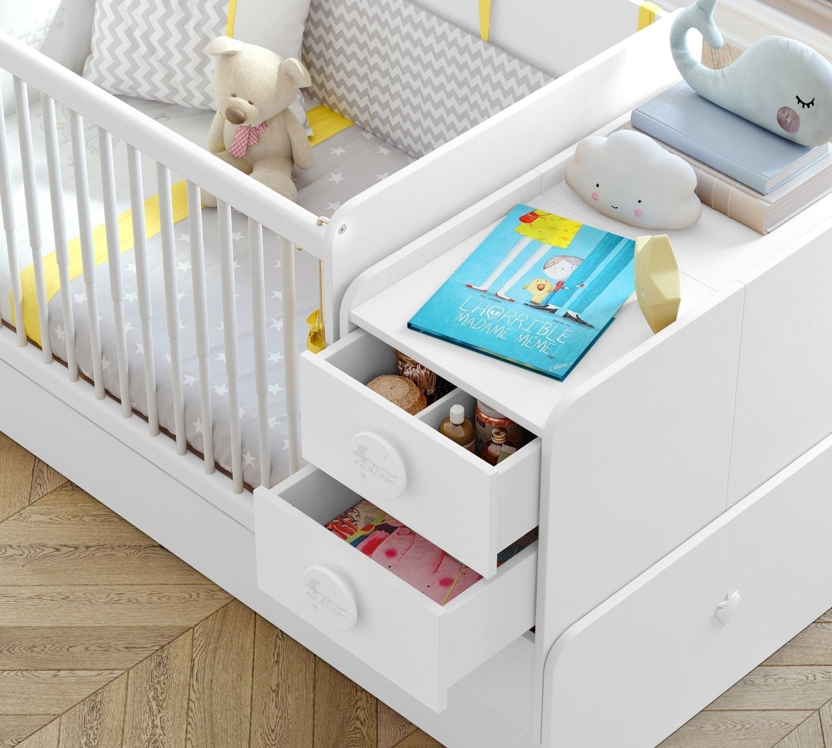 The unit, designed with functional features at the front, facilitates the mother's access to her baby thanks to the telescopic lift handrail, and a swing device can be installed on both sides if desired. When the product is enlarged, the handrail part can be used as a workbench, and in sections with drawers and shelves, it can be used as a nightstand or a large storage area.